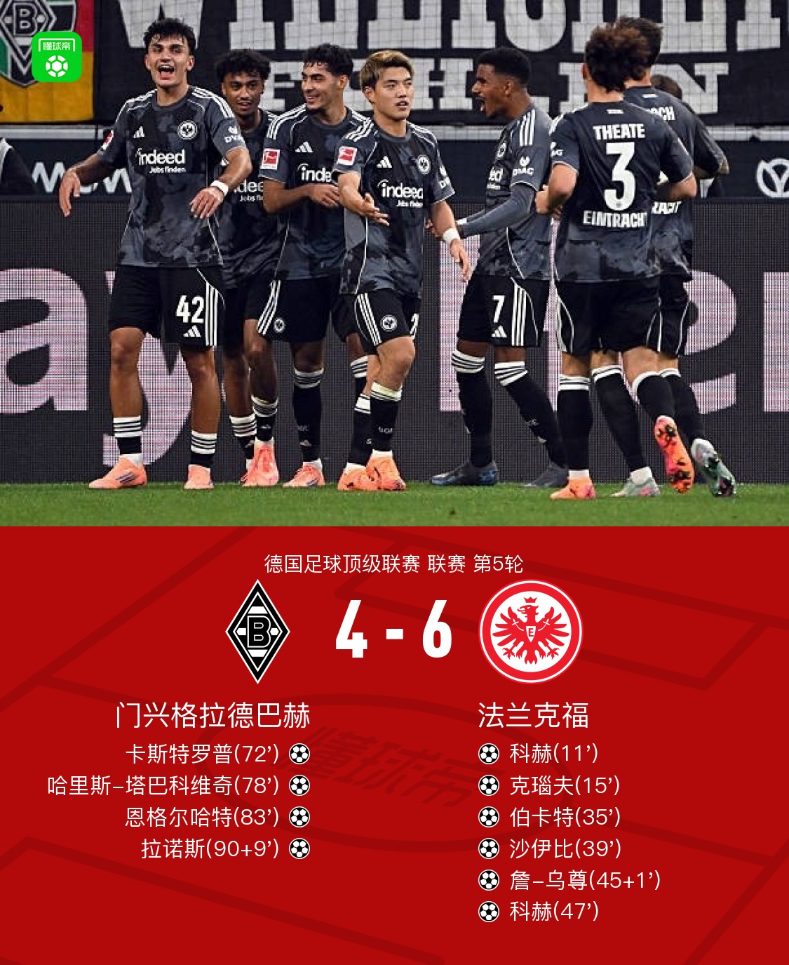 北京时间9月28日,德甲联赛第五轮激战正酣,门兴格拉德巴赫坐镇主场迎战法兰克福。此役,法兰克福展现了惊人的进攻火力,科赫独中两元,克瑙夫、伯卡特、沙伊比与詹-乌尊亦各建一功,助球队连下六城。门兴虽在逆境中由卡斯特罗普、塔巴科维奇、恩格尔哈特及拉诺斯连追四球,但终究未能挽回败局,最终法兰克福以6-4的比分客场告捷。点击查看本场比赛详细数据>>点击查看德甲完整积分榜>>关键事件